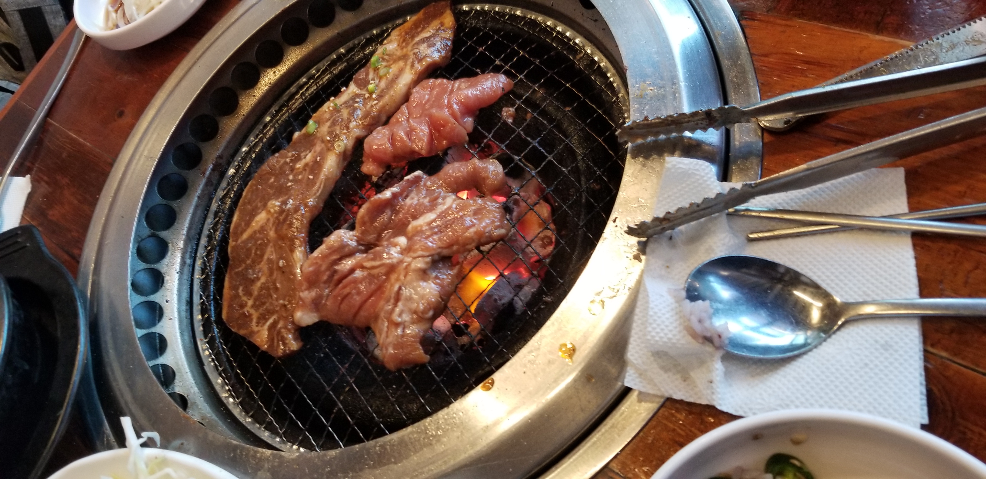 Now as I am in South Korea, I obviously did not come here for their Mexican food. I have many occasions endeavored to try traditional Korean cuisine. One of my favorites being Korean BQQ or just marinated grilled meat in general. I especially like the cook-it-yourself aspect. If I want my food well done, then so be it. Your choice of meat is usually coupled with many side dishes or ๋ฐ์ฐฌ (Banchan). which can consist of lettuce wraps, garlic, kimchi, pickled radish, some type of traditional soup (It varies), and when you ask for it sticky rice. The rice shown in the second picture is purple in color and mixed with several grains, its name is ํ๋ฏธ๋ฐฅ (heukmi bap), which literally translates to black rice. This rice is said to be healthier than white rice due to antioxidants, which are great for keeping your heart healthy and some say helps lower the risk of cancer.
