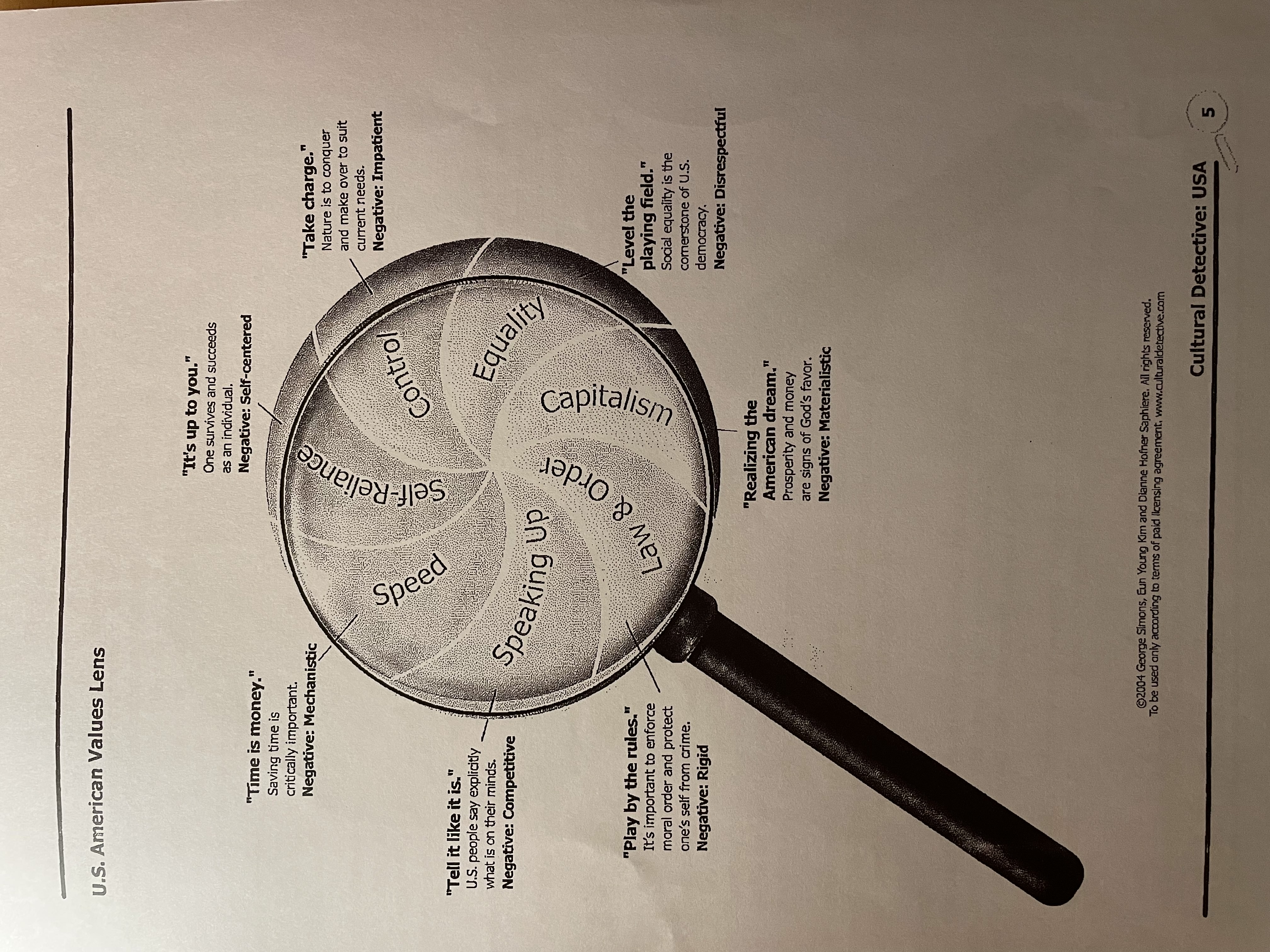 While explaining the American cultural values to my Cultural Partner, I noticed how individualistic and capitalistic the US is. Its focus on speed and capitalism really define the US as the American dream is an idealistic goal many try to achieve. Often, to achieve the American dream, individuals, often from immigrant backgrounds, work extremely hard. They would work endlessly and for those who are lucky, they are able to accumulate wealth and purchase property to achieve that American dream. With the growing economic changes and where inflation can rise above wage increases, the Dream might never be attainable but regardless an important value to the US.