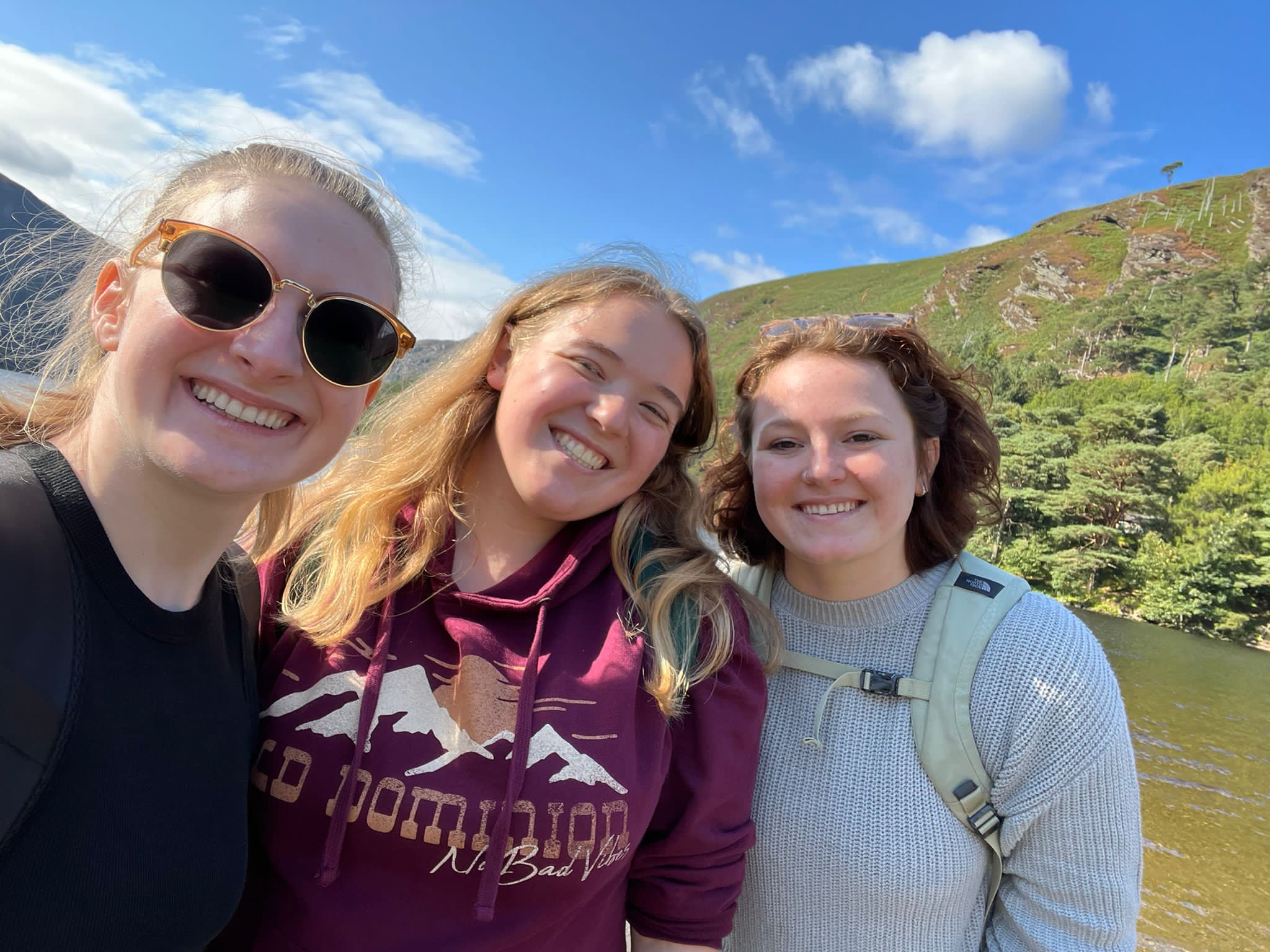 Our next adventure in the county of Wicklow was to Glendalough which literally means the valley of 2 lakes. So, the next photo is me in the middle with my 2 friends at one of the lakes. Besides just seeing the lakes, we were also able to see the remnants of Saint Kevin’s monastic community. In his community, there was a classic Irish round tower along with churches and gravesites. Our tour guide was able to tell us a little about Saint Kevin’s ministry in that when he moved away he altered the cross design a little bit. So, the classic design of a Irish cross has a circle in the background because it is believed that a lot of Pagans believed in the stars and the moon. In order to relate to the Pagan’s religion, Saint Kevin altered the cross to include the circle to be similar to the moon. I thought that was just such an interesting piece of history despite not being super religious and a good way to end my first week here. I’m very excited to see what’s to come!