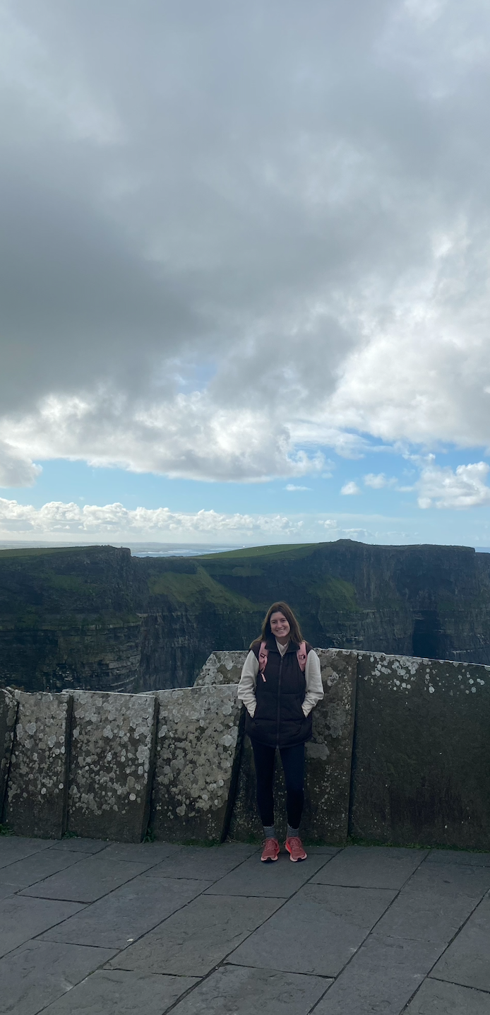 A 5 am wake up call is not something I am normally happy about, but today it was completely worth it. After a nice nap on the Wild Rover tour bus I awoke to cows and sheep right on the side of the road. The tour guide explained agriculture is the second largest industry in Ireland, behind tech, and that we would be seeing many more cows and sheep on our way to the Cliffs of Moher! Another hour or so passed and we finally arrived. The cliffs are what my professors like to call quintessentially Irish, so I had really high expectations for what I was about to see. Thankfully I was not disappointed! The views even from a lower altitude were incredible and once we reached a high point I was amazed. They look like something out of a mystical movie, we were later told they were used in the sixth Harry Potter film. The views coupled with the adorable old man playing traditional Irish music made me feel like I was finally experiencing the โrealโ Ireland, or more truthfully the stereotypical Ireland everyone fantasizes about. I was really impressed with the many different walking path options which allowed us to get an individualized experience and see the Cliffs from a variety of angles and perspectives. One word of warning, do not walk too close to the fences unless you want to smell of cow poop for the remainder of the day.